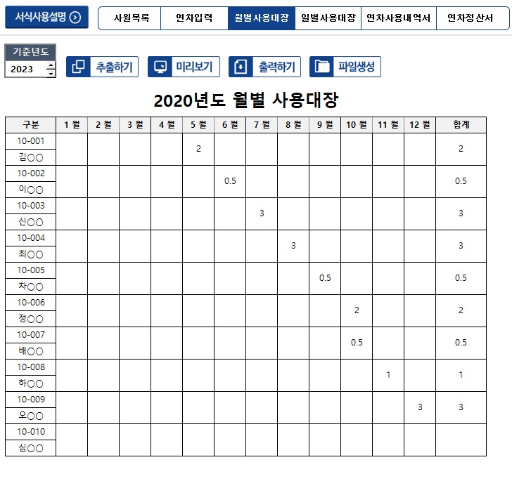 월별로 연차를 사용한 갯수를 입력할 수 있으며, 1월부터 12월까지 연차 합계까지 입력할 수 있습니다. 월별 사용대장뿐만 아니라 연차관리 엑셀 프로그램에 '일별사용대장' 항목도 포함되어 있습니다.