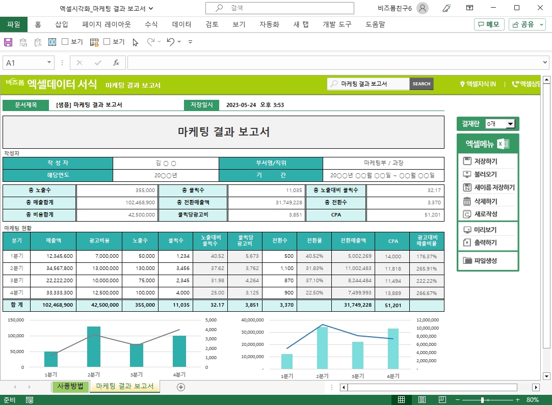 [마케팅 결과 보고서]인 엑셀 데이터 서식으로 엑셀 차트를 활용해볼 수 있는데요. 엑셀 데이터 서식에 노출수와 클릭수, 매출액과 전환 매출액을 막대 차트를 사용하여 한눈에 비교할 수 있는 데이터가 있기 때문입니다.
