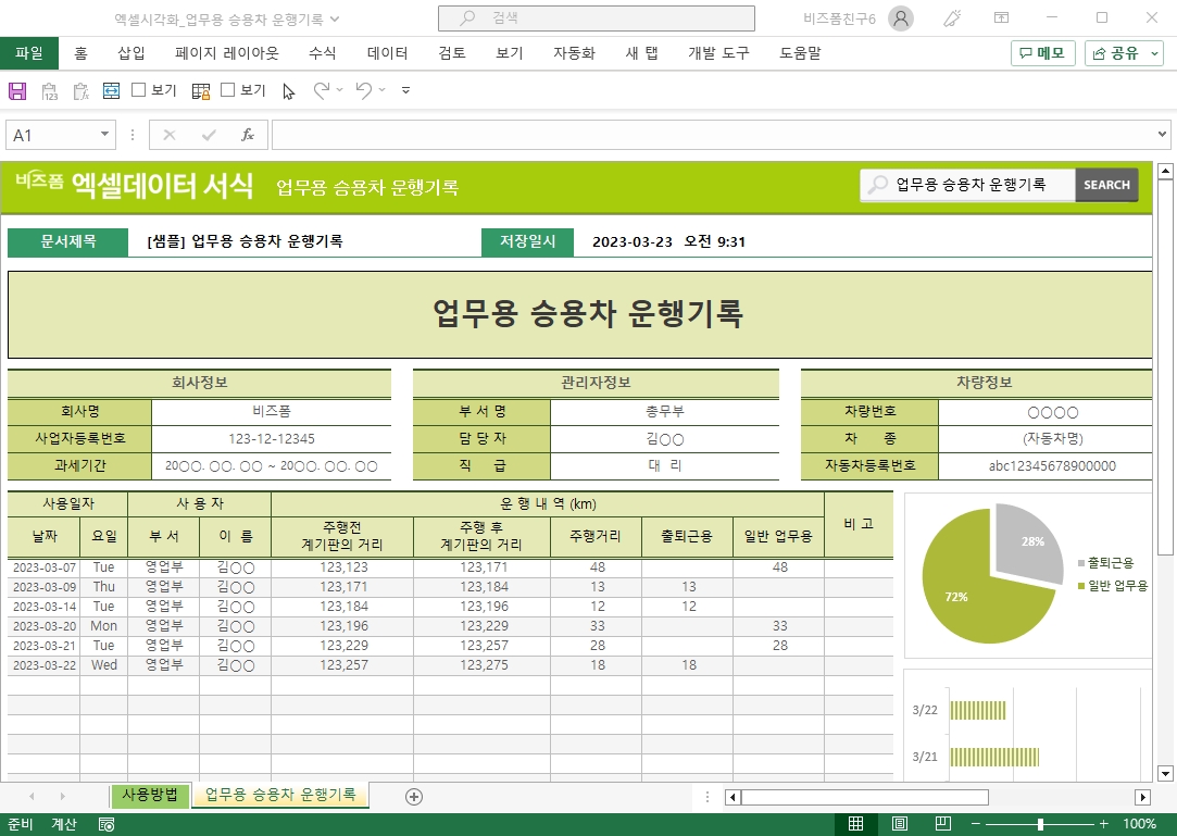 엑셀 차트 활용 예시(업무용 승용차 운행기록) 다운로드!