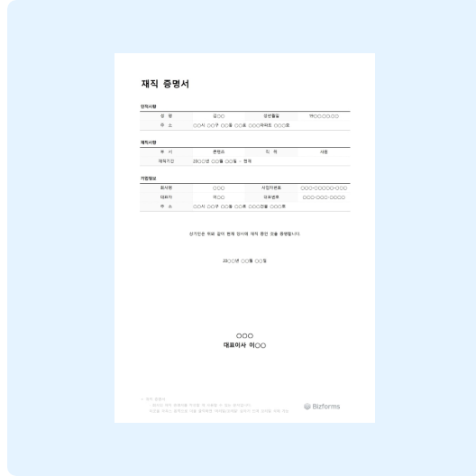 위 모든 유형의 재직증명서 양식을 비즈폼에서 제공합니다.