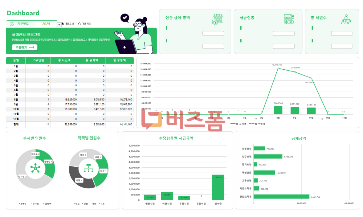 급여관리 프로그램(대시보드, 4대보험요율 자동 업데이트, 급여대장, 급여명세서, 급여입금내역서, 급여결산보고서, 재직증명서, 근로계약서) 양식, 엑셀프로그램, 통합관리, 급여관리 프로그램
