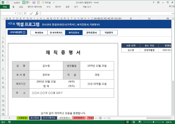 1️⃣ 인사관리 프로그램 (인사기록카드 + 재직증명서 + 직원명부)
