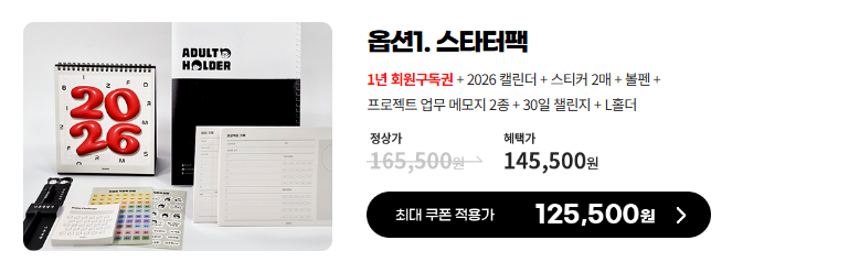 - 구성: 2년 회원구독권+달력 2개+스티커 4매+볼펜 2개+프로젝트플래너 3종+무선노트+30일 챌린지+L홀더