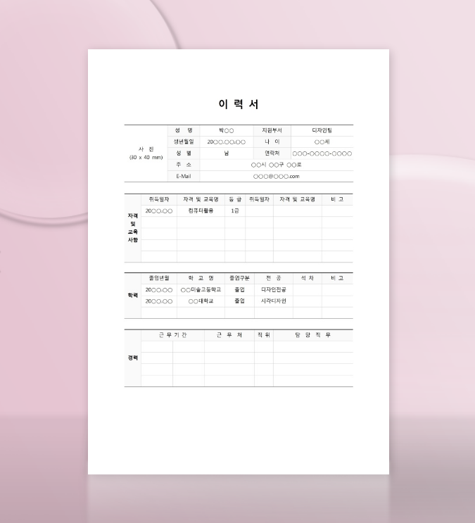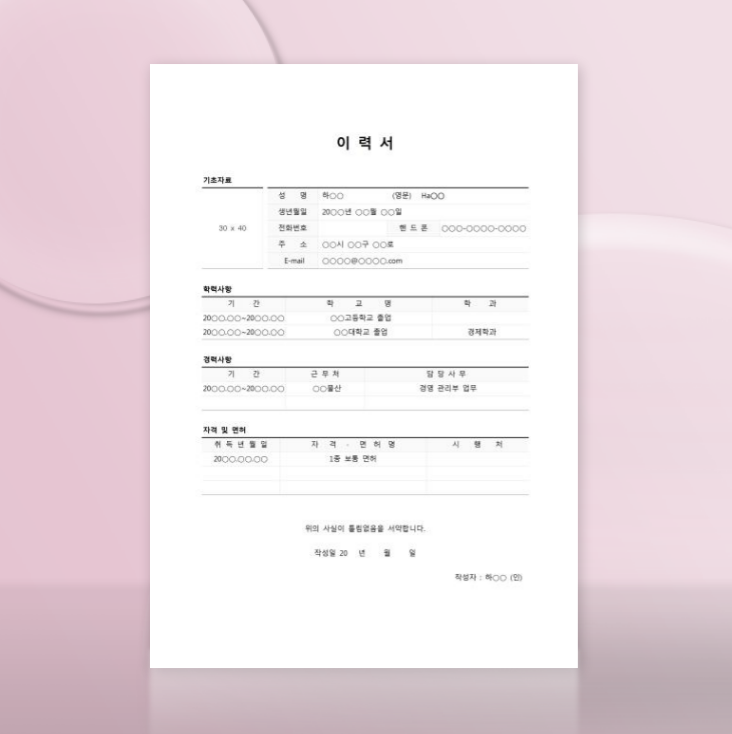 깔끔하고 심플한 기본형 이력서입니다. 인적사항, 학력사항, 경력사항, 자격 및 면허사항으로 구성되어 있어 첫 이력서 작성에 완벽해요.