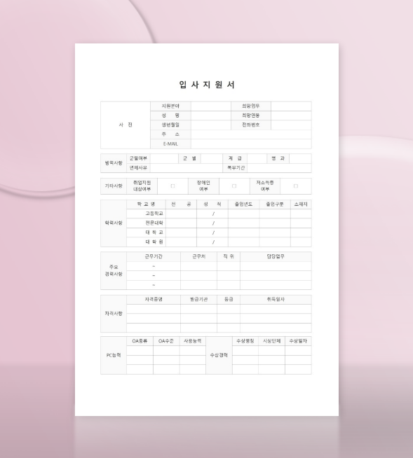 이력서만으로는 부족하죠! 입사지원서, 자기소개서, 경력기술서가 모두 포함된 올인원 서식입니다.