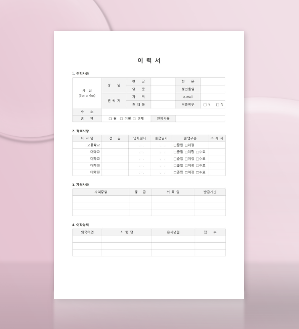- 인적사항, 학력사항, 자격사항, 어학능력, 경력사항 등 체계적 구성