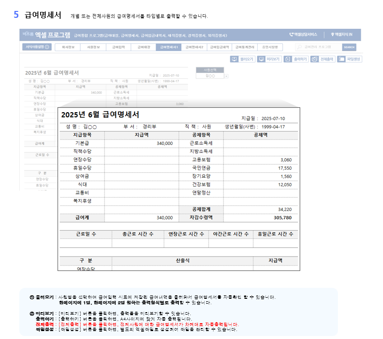 - 4대보험 자동 계산 (근로소득세, 지방소득세, 고용보험, 국민연금, 건강보험, 장기요양보험)