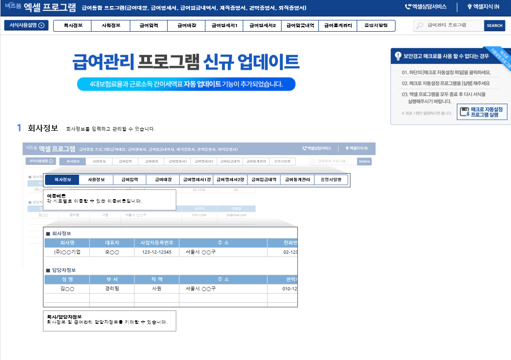 특히 [최신 업데이트] 버튼 하나로 매년 개정되는 4대보험요율과 근로소득간이세액표가 자동으로 업데이트되어, 복잡한 계산 실수를 방지할 수 있습니다.