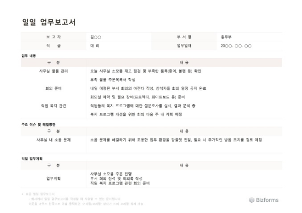 하루 또는 일주일 동안 수행한 업무와 결과를 정리하여 보고하는 문서로, 업무의 투명성을 높이고 팀 내 소통을 원활하게 합니다.