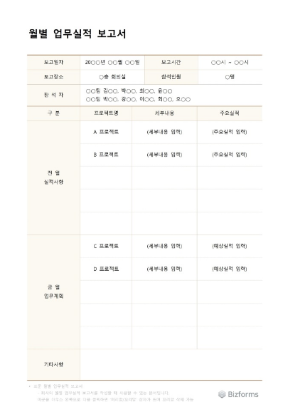 매달 수행한 업무와 성과를 정리하여 보고하는 문서로 조직 내 업무 효율성을 높이는데 활용됩니다.
