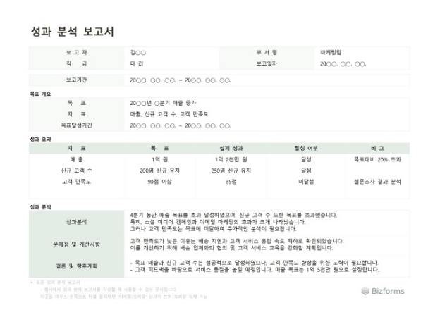 목표와 목적, 데이터 수집 및 분석 방법, 성과 결과를 포함하여 조직이나 프로젝트의 성과를 평가하는 문서입니다.