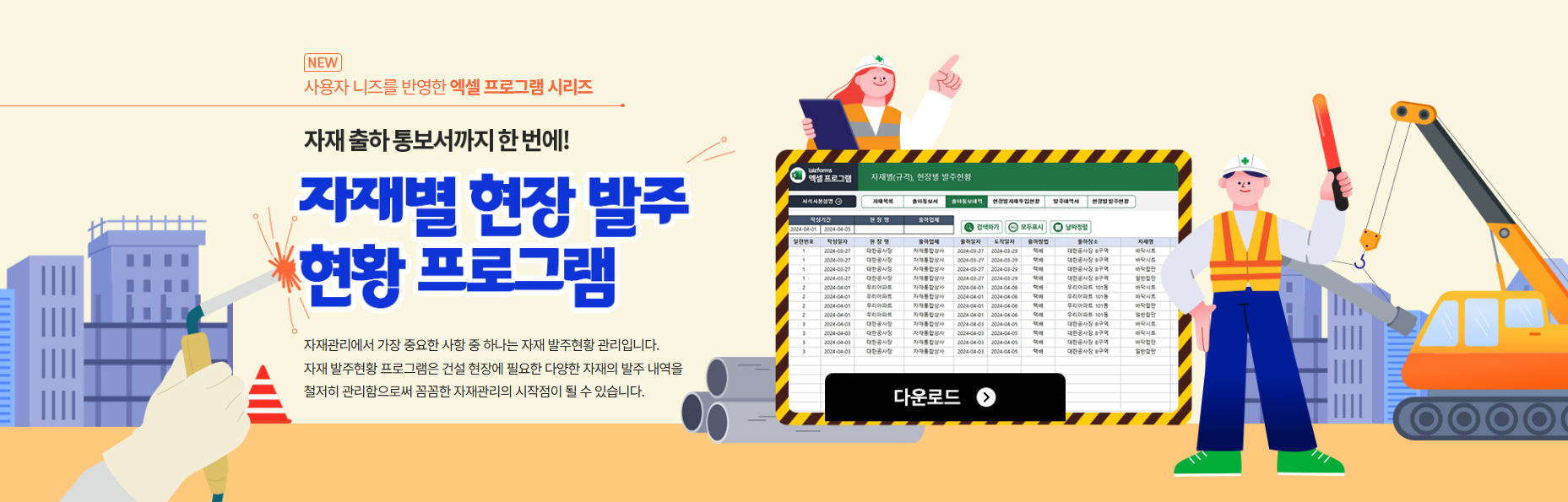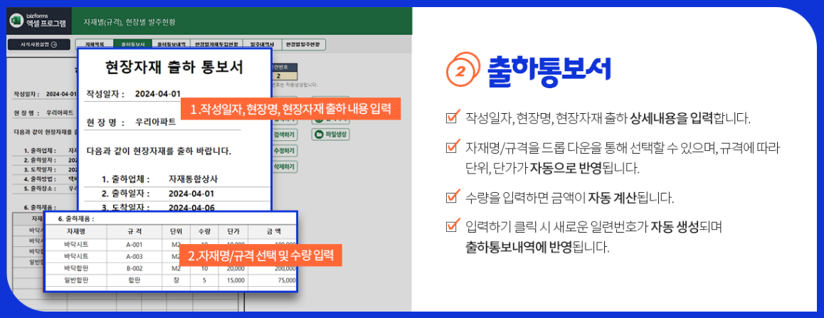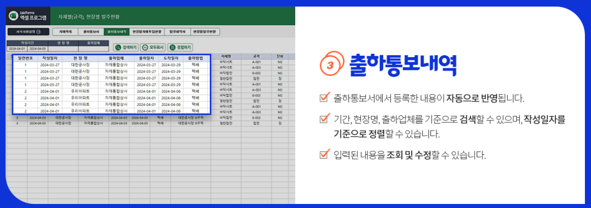 자재 출하 통보서까지 한번에! 자재별 현장 발주현황 프로그램