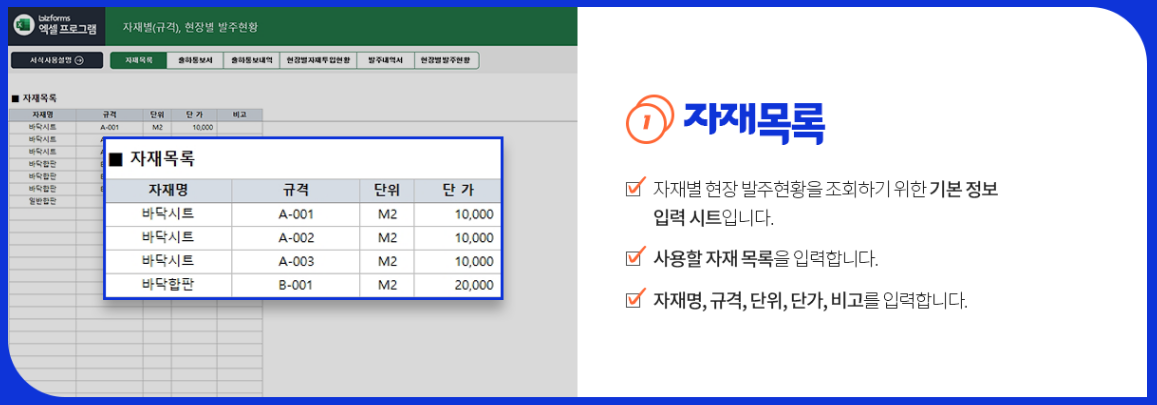 비즈폼에서 나온 자재별 현장 발주 프로그램 이거 진짜 미쳤습니다. 제가 위에서 설명한 거? 그거 다 들어있어요. 아니, 그것보다 더 많이 들어있습니다. 🔥