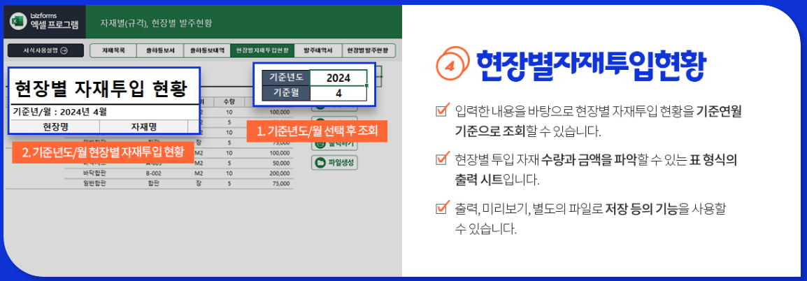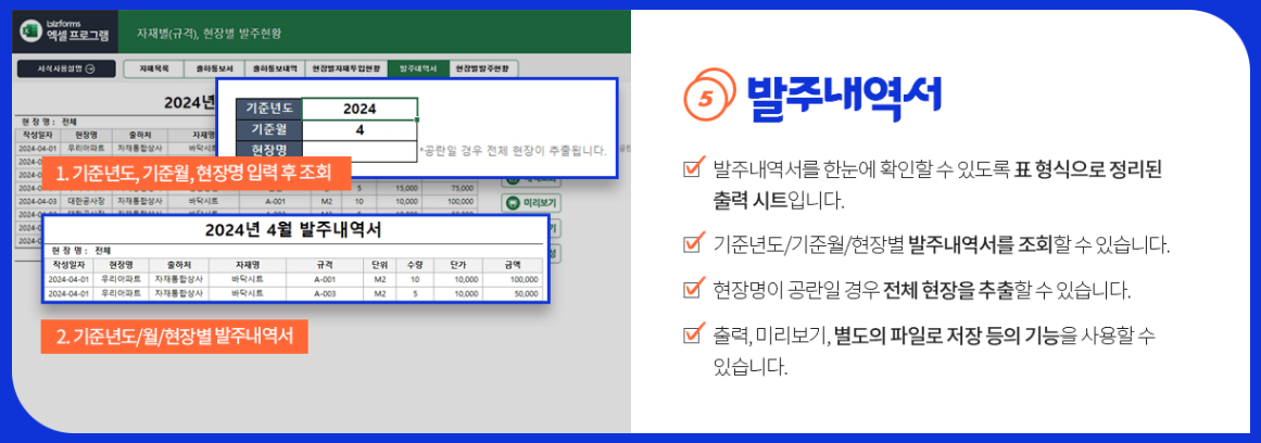 년도/월/현장별로 발주내역서가 표 형식으로 쫙 나옵니다. 그냥 출력만 하면 끝! 미리보기, 별도 파일 저장 기능까지 다 있어요. 📊